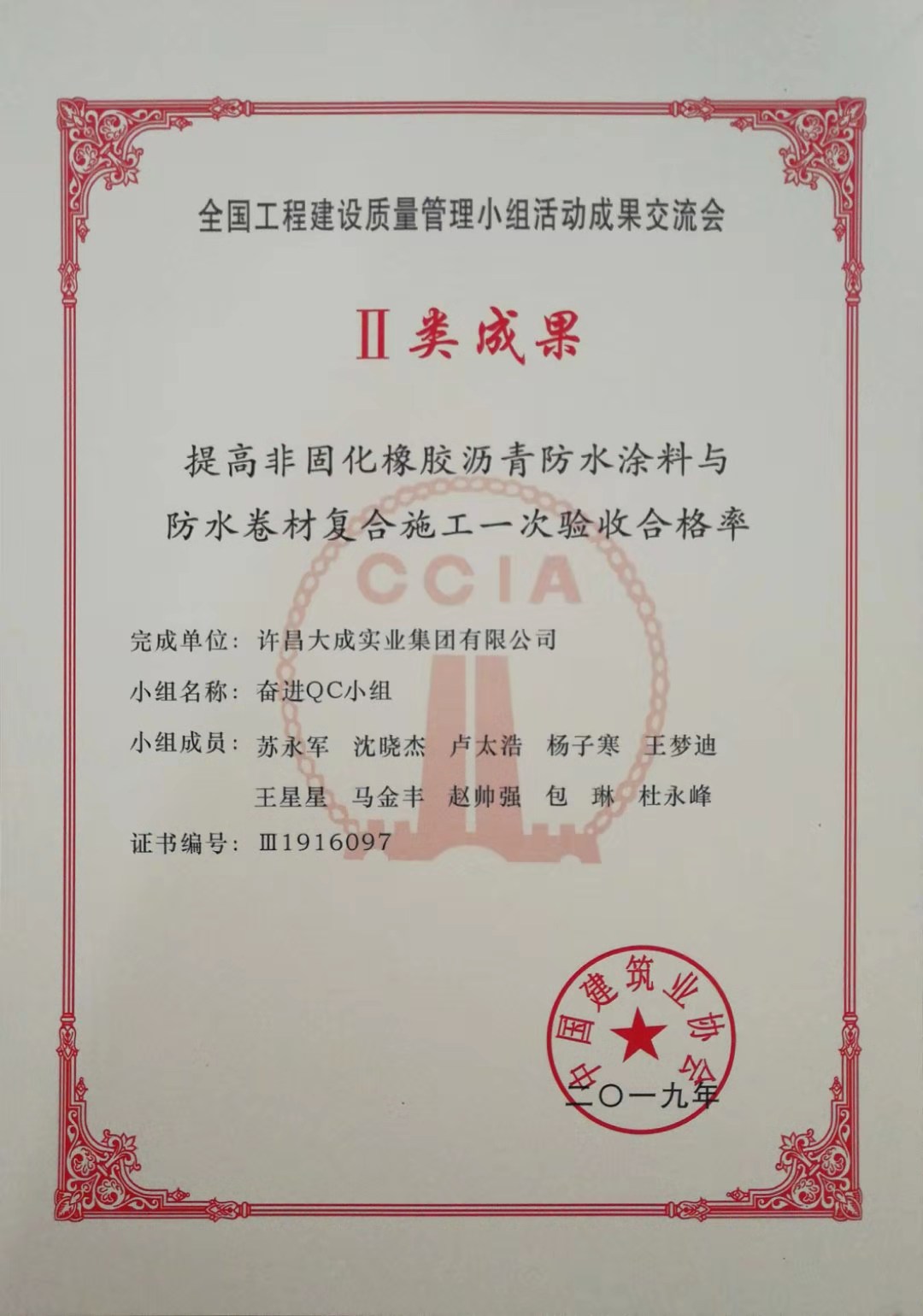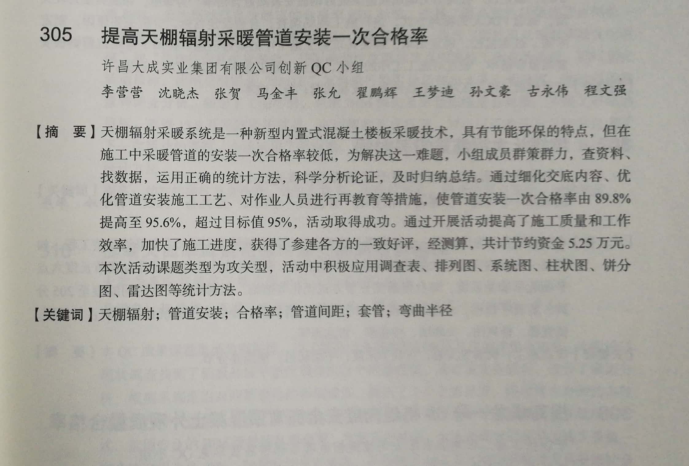 国家级优秀质量管理成果交流活动竞争非常激烈,每年全国各地推荐指标有限,成果质量要求较高。我公司两项成果在省内行业协会发布均为一等奖,作为河南省优秀质量管理成果被推荐参加国家级发布交流会,其中发布成果《提高天棚辐射采暖管道安装一次合格率》以选题新颖、活动记录完整、过程资料详实,得到了与会专家和行业同仁的肯定和认可,被汇编入《全国工程建设质量管理小组活动成果选编(2019)》中。交流成果《提高非固化橡胶沥青防水涂料与防水卷材复合施工一次验收合格率》也以PDCA程序正确、统计工具运用得当被认定为Ⅱ类成果。