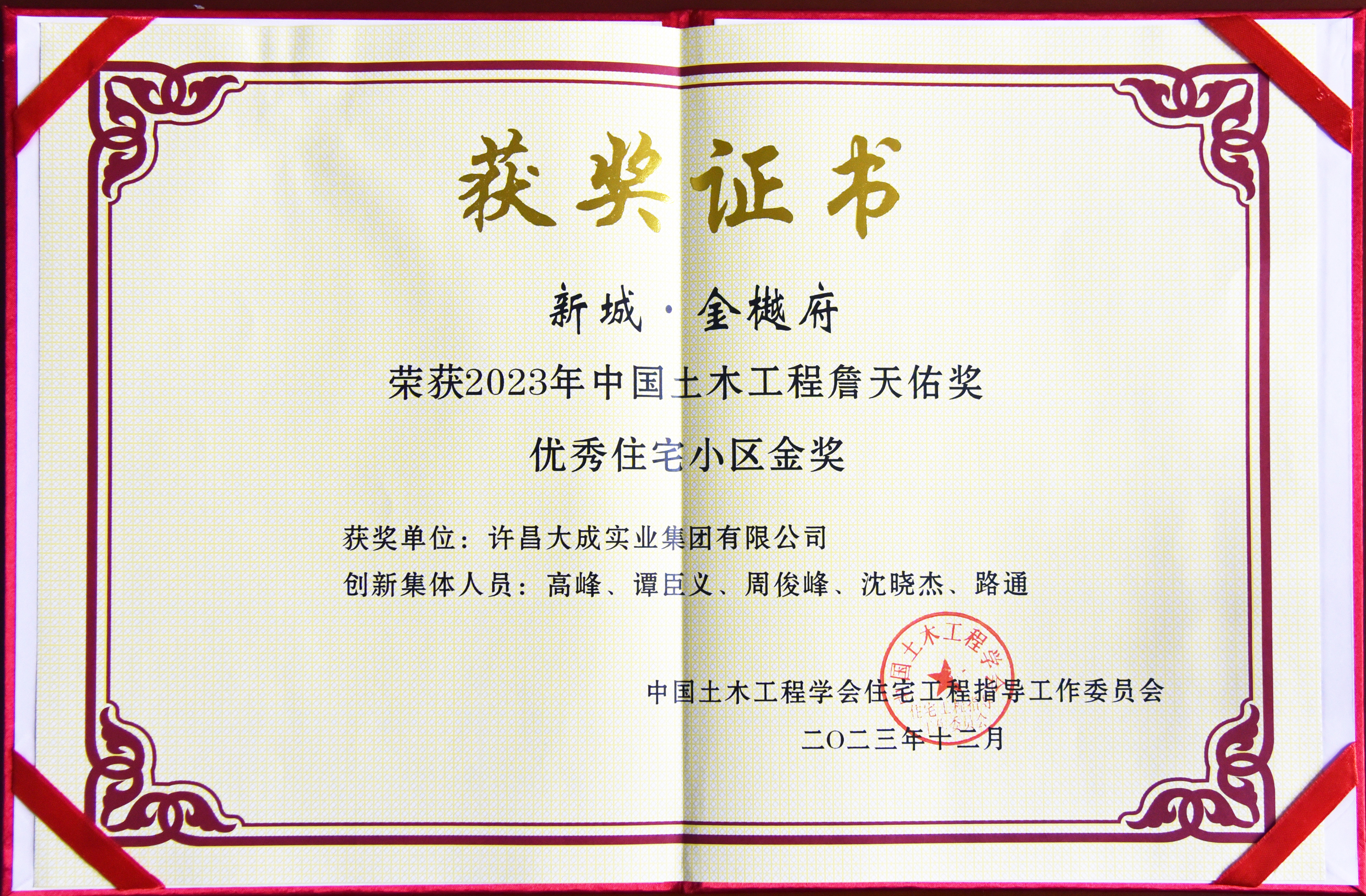 近日,在北京召开了2023年度中国土木工程詹天佑奖优秀住宅小区技术交流会。本次会议以“绿色建造、创新未来”为主题,旨在表彰在住宅建设领域取得杰出成就的项目。在这次会议上,集团公司第九分公司负责施工的新城·金樾府项目荣获了2023年中国土木工程詹天佑奖优秀住宅小区金奖,这是对该项目的高度认可和荣誉。
